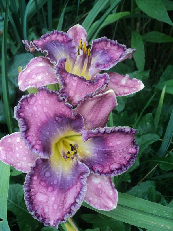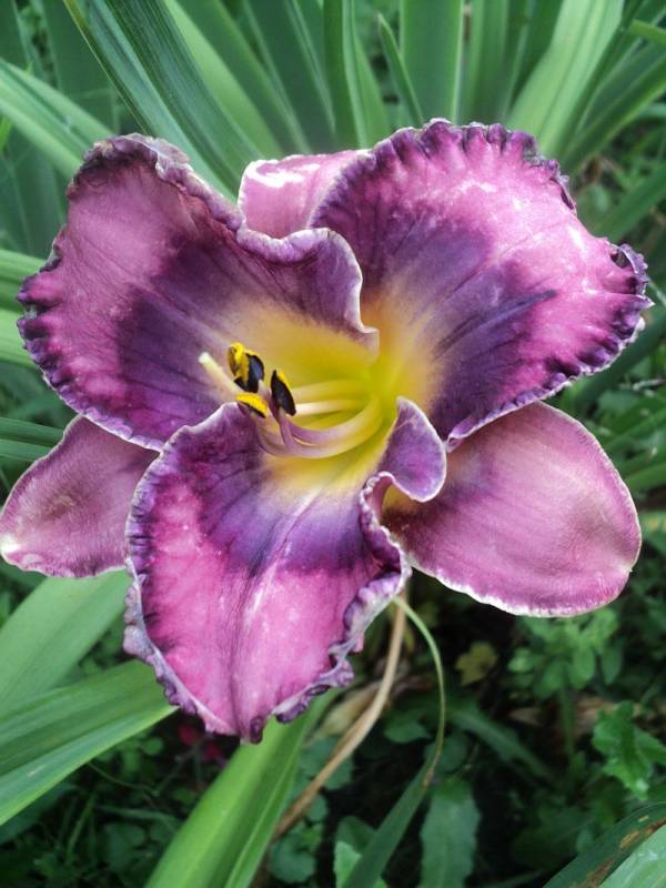 Kwiaty: kwiaty w kolorze fiołkowo-różowym , z fioletowym ,cieniowanym okiem i platynowo -fioletową falbanką na brzegach płatków , gardło żółto-zielone. . Wielkość kwiatu ok 11 cm.