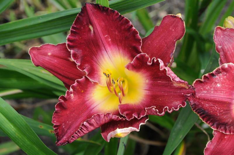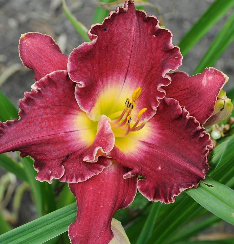Hodowca: Moldovan, 1994 Wysokość: 60-70 cm Kwiat: o wielkości 15 cm, purpurowo czerwony, przechodzący w różowo-czerwone oko w żółtą, a głębiej zieloną gardziel. Płatki wykończone falbanką z białą lamówką. Kwiat często rozwija się w nocy, więc w dzień jest albo nie do końca otwarty, albo już przekwitający. Podobno pachnie, ale jeszcze nie sprawdzałam. Termin kwitnienia: lipiec, sierpień