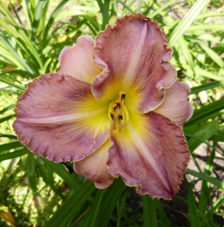 kwiat 14 cm, burgundowo fiopletowy z burgundowym okiem, złotym brzegiem i zieloną gardzielą, może powtarzać kwitnienie