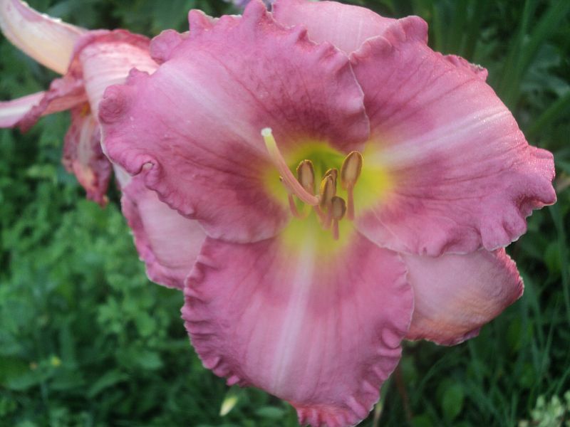 Hodowca: S. Achramowicz, 2017 Wysokość: ok 110 cm Kwiaty: kwiaty koloru pastelowo różowego z odcieniem czerwieni z wąskim o odcień ciemniejszym , rozmytym okiem , płatki wykończone falbanką , gardło kremowozielone. Wielkość kwiatu ok 14 cm. Stanowisko: słoneczne do półcienistego. Mrozoodporność: zimuje bez okrycia. Uwagi : z informacji hodowcy wytwarza 3 – 4 groniastych rozgałęzień i około 30 pąków - u mnie pierwszy rok , więc ta informacja będzie do weryfikacji . To jego pierwsze kwitnienie , zdarzały się kwiaty półpełne , zobaczymy jak będzie zachowywał się w nastepnych sezonach. Zakwitł pod koniec sezonu . Kwiaty pachną.