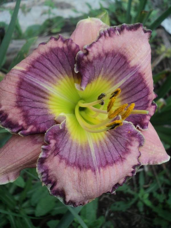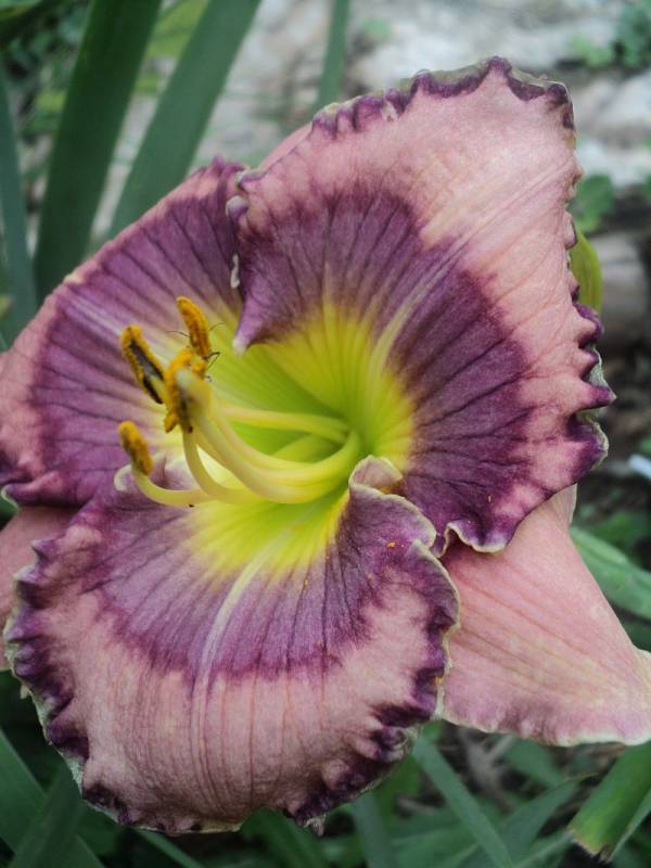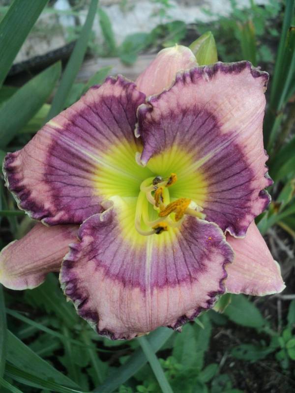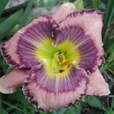 Hodowca: J.Bodalski 2016 Wysokość: ok 75 cm Kwiaty:Kwiaty jasno różowe z niebiesko lawendowym okiem i dwubarwną biało- lawendową falbanką , gardło zielono-żółte . Wielkość kwiatu ok 14 cm. Stanowisko: słoneczne do półcienistego. Mrozoodporność: zimuje bez okrycia. Uwagi : 2 rozgałęzienia,14 pąków na pędzie , w/g informacji hodowcy powtarza kwitnienie .