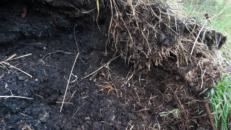 Pryzma jest wielowarstwowa – można wybrać mniej lub bardziej rozłożony materiał. Nie jest typowo z liści drzew, ale wszystkich roślin, które są przeznaczone na kompostowanie, tutaj na zdjęciu od góry widać stare trawy i siano.