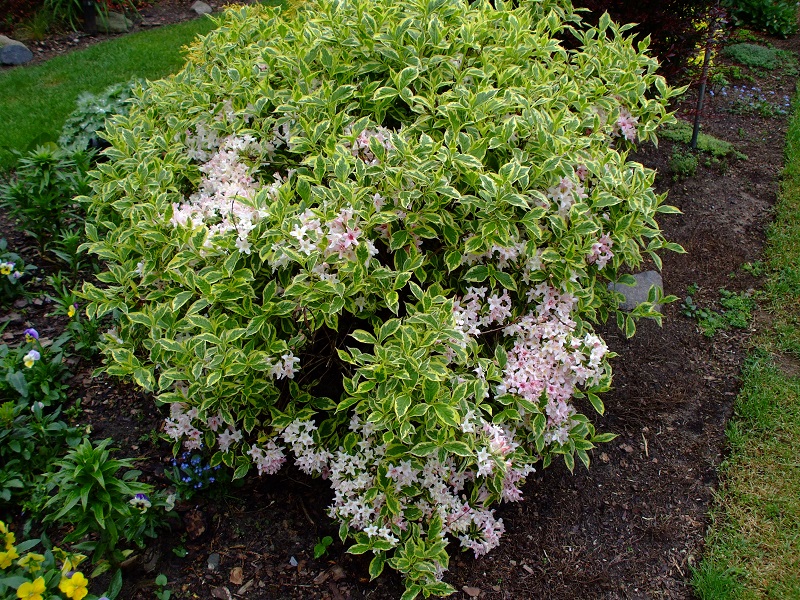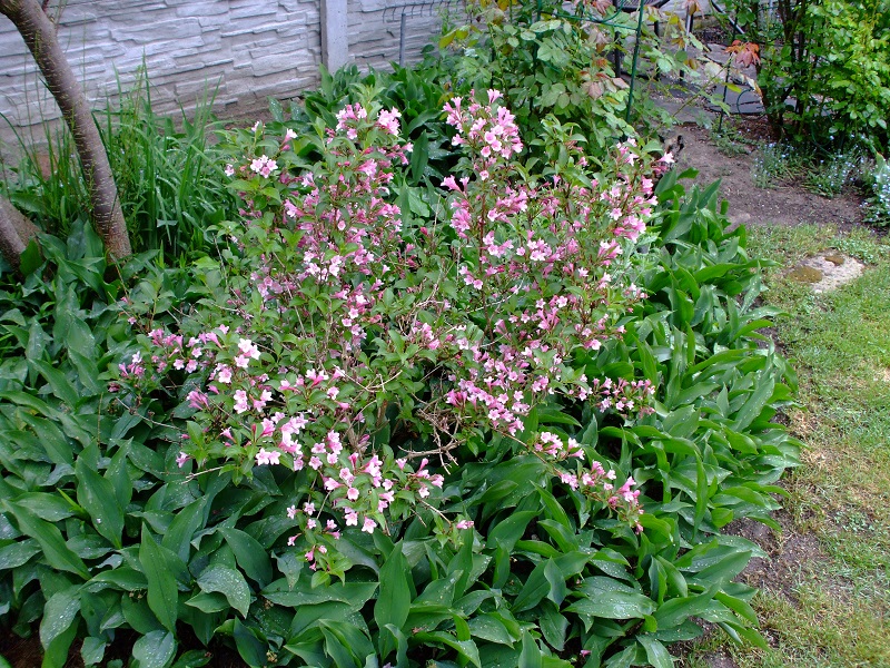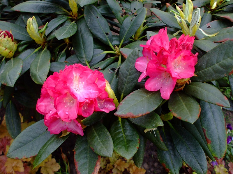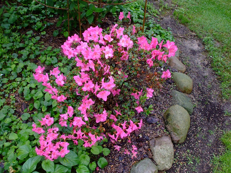 rododendrony zaczynają zakwitać, niektóre pojedynczymi kwiatami. Te dwa, co roku tak dziwnie zakwitają połową krzaczka, tą od słonecznej strony. Później zakwita druga strona.