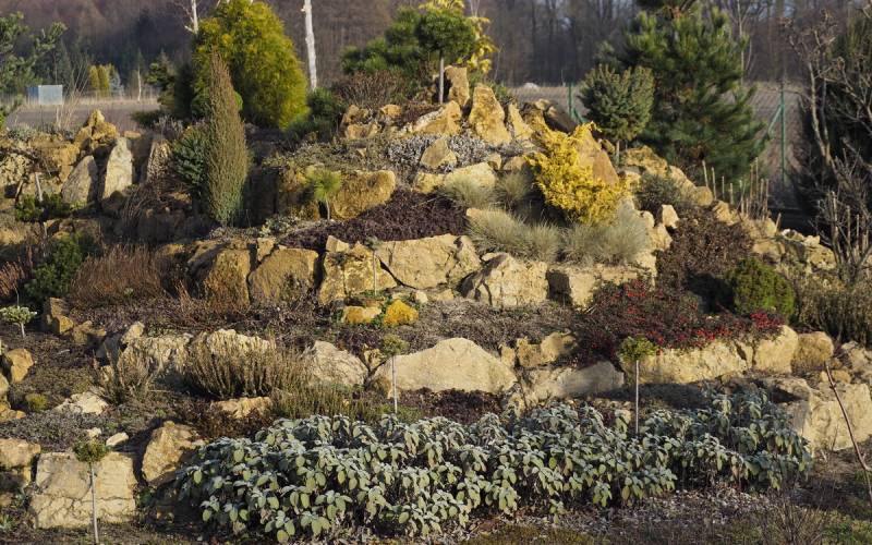 Beato kolorowe głazy fajnie kontrastują z roślinami i nie zlewają się z podłożem. Przez to ogród skalny zyskuje na wyrazistości.