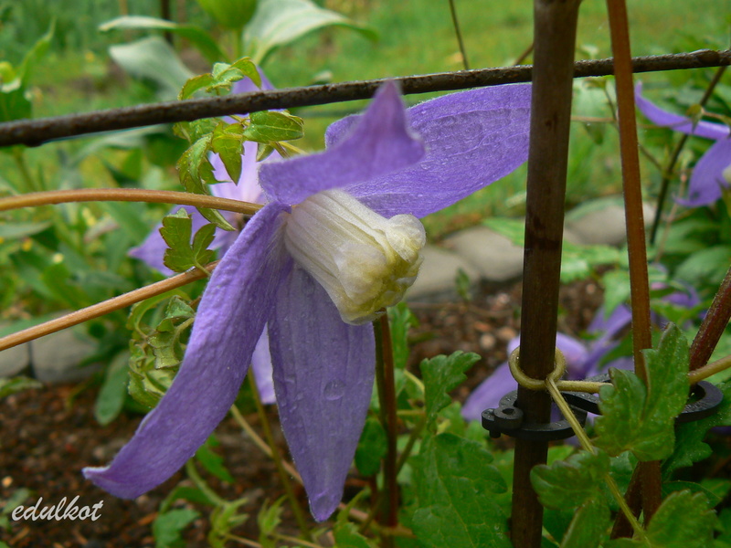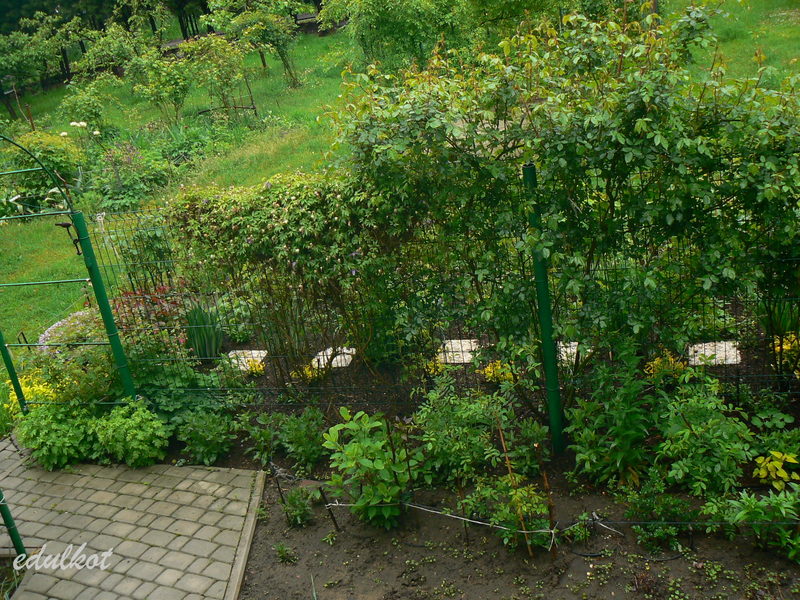 prawie na wprost w środku widać klatkę z pnącymi różami i powojnikami, a dołem płotek z takimi samymi nasadzeniami