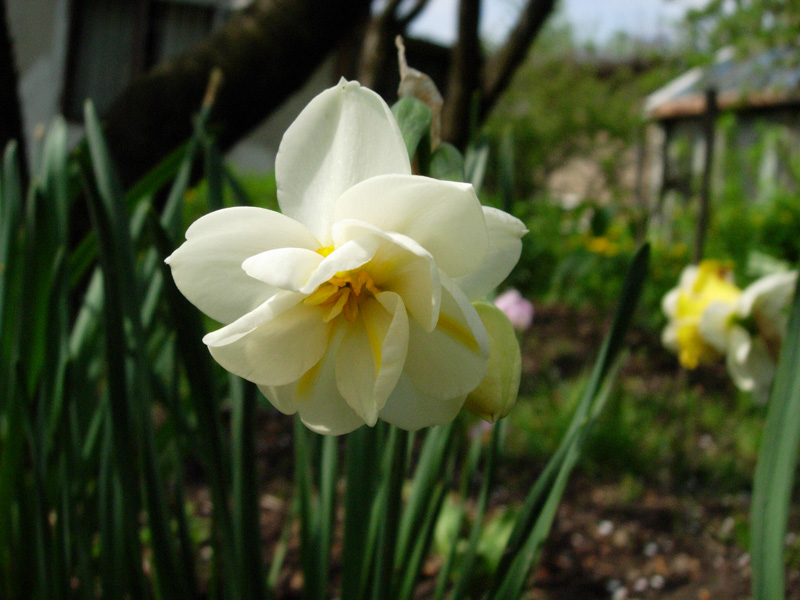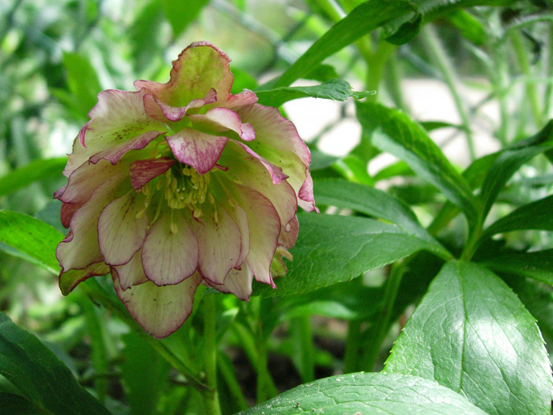Najpierw pokażę najostatniejszy (czyli drugi) kwitnacy u mnie ciemiernik – tamtegoroczny nabytek. Patrzyłam wczoraj na ciemierniki, to tak zmężniały, a kilka, co to myślałam, że zniknęły zaczyna wydobywać się z niebytu. Martwi mnie tybetański, bo ma tylko jednego listka. Może go więcej podsypię ziemią kompostową (może z popiołem?). Jesienią nasypię na niego zrębków, niech go zasłonią przed ptasimi pożeraczami wszelkich roślin, a zwłaszcza młodych pączków. Te potwory wykończyły mi hiacynty między różami.