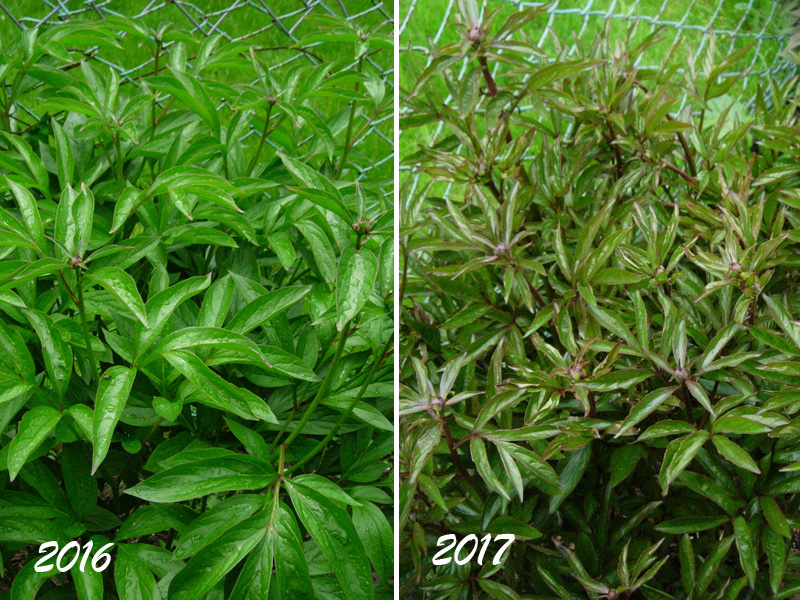 Później listki jej się rozwijają. Zdjęcie połączone – to po lewej stronie jest z 11 maja 2016 roku (uważam, że bardziej zaawansowana w wegetacji, niestety pączki kwiatowe zaschnięte).