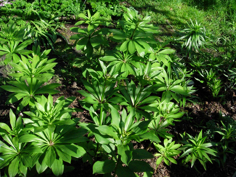 Tutaj jeszcze rzut oka na kwaśne poletko doświadczalne. Rośnie tu m.in. Lankongese (już wypuścił pęd) oraz domniemane – amerykanka i kanadyjka, choć jedna lilia jak nic wygląda mi na martagona. Jest to również miejsce lilii Fusion, która wyglądała równie żałośnie jak martagony (jeden cienki pędzik – w tym roku dwa i może zakwitnie – ta od lewej).