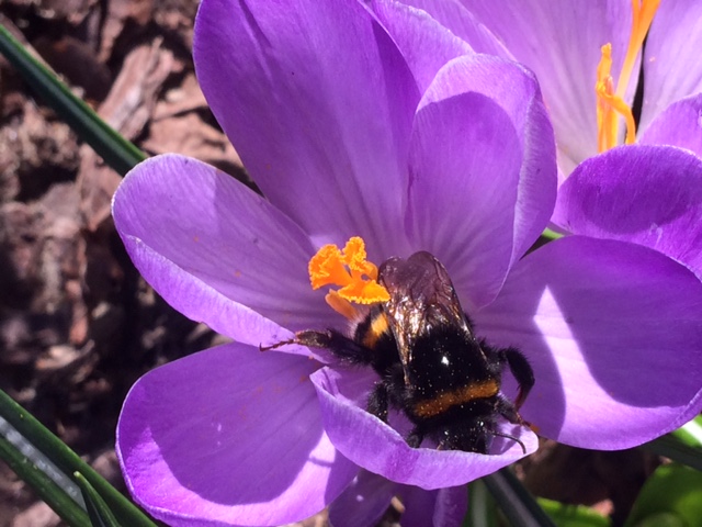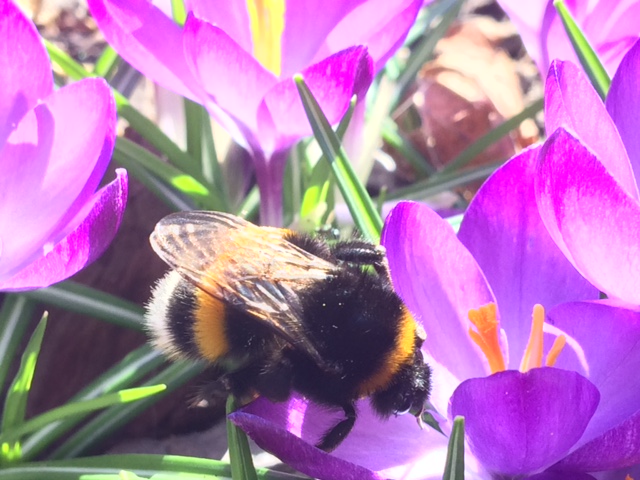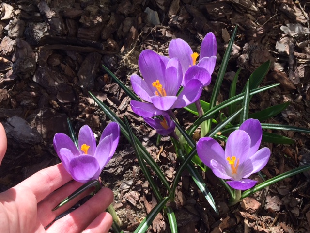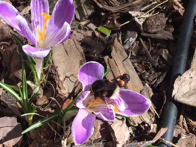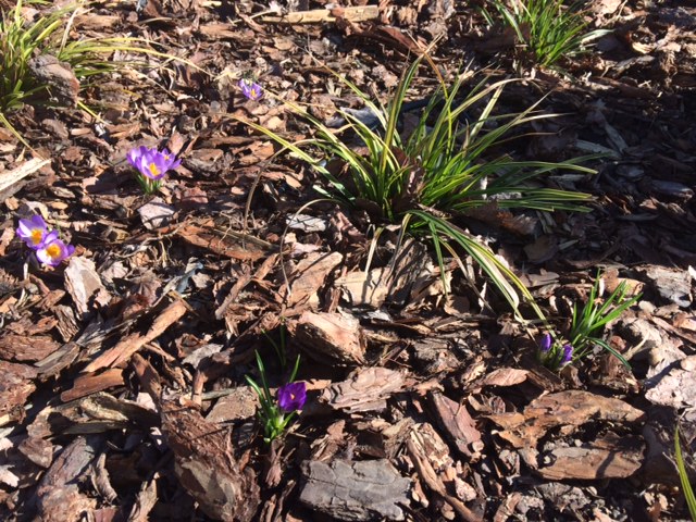 tu na razie skromnie, bo krokuski niskie, część w szczypiorach.. Maluszki dzielnie jednak kwitną tuż po wystawieniu nosów znad kory