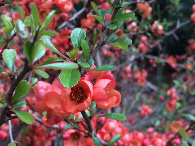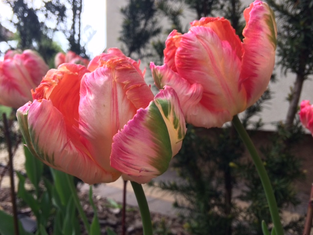 bardzo ładnie mi się tu skomponowały pomarańczowe trochę tulipany z łososiowym pigwowcem w tle