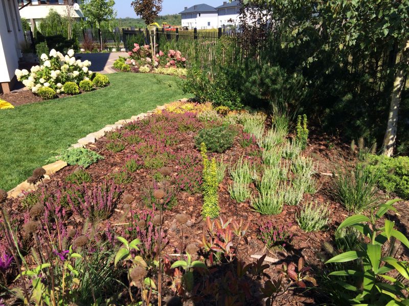 Większośc fioletowego wrzosowiska zakładałam z Kasią RObaczkiem rok temu, więc ten rok jest najmniej efektowny pod względem kwiatów. Tylko część płomiennych i kilka fioletowych ma 3 lata i są bardzo okazałe. Reszta trochę nieopierzona, ale dogonią starsze egzemplarze..kiedyś