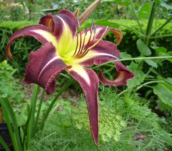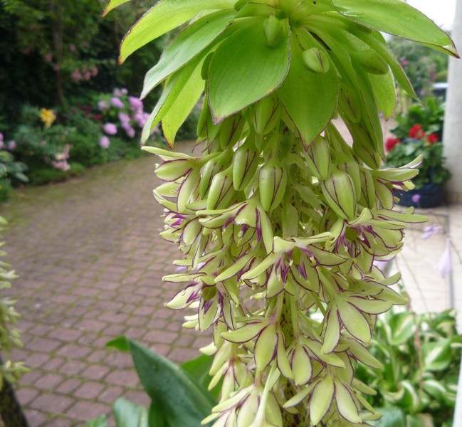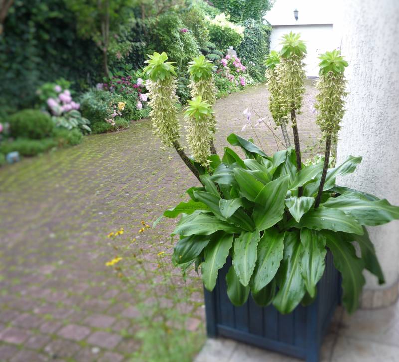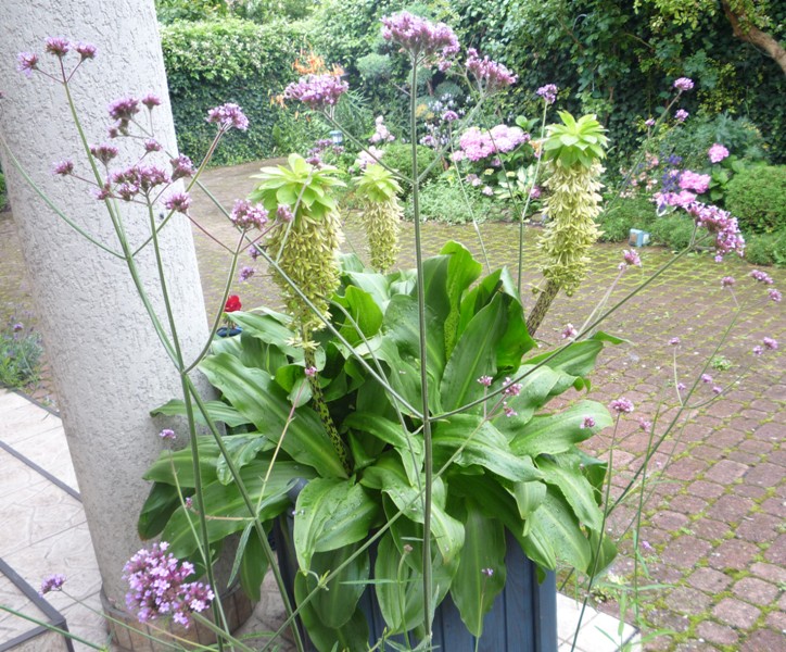 Werbena wysiewa się w kostce brukowej i dodatkowo jest dekoracją . Wiosną w skrzynkach sadzę drobniutkie bratki ,które po przekwitnięciu usuwam a Eukomis rośnie już dojesieni