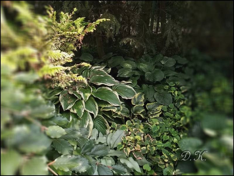 Osobną grupą są hosty. One również są ze mną od wielu lat. Ale jako liście ozdobne. Takie wypełniacze cienistych miejsc, wtedy. I co się okazało? Jak zobaczyłam w jaki sposób wypełniają te przestrzenie pod drzewami, jakie potrafią urosnąć duże w końcu jakie mają kolory, wpadłam w zachwyt. To nie są tylko wypełniacze, to wspaniała roślina, która sama może być piękna, a w grupie nadać charakter miejscu, które ciągle jakieś nijakie było.