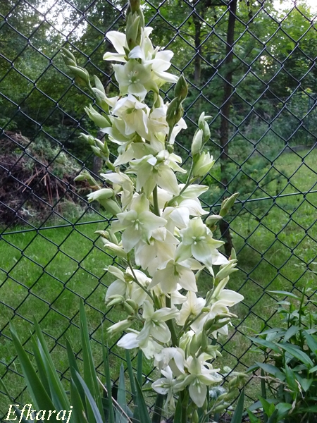 Pod lasem mam wsadzone juki. Zastanawiam się nad przesadzeniem ich bardziej do słońca, bo mają zupełnie inne kwiaty, niż te, które rosną mi w słońcu. Te słoneczne, mają dzwoneczkowate kwiatki, te w cieniu są szeroko otwarte, o mięsistych płatkach. Wyglądają jak z porcelany