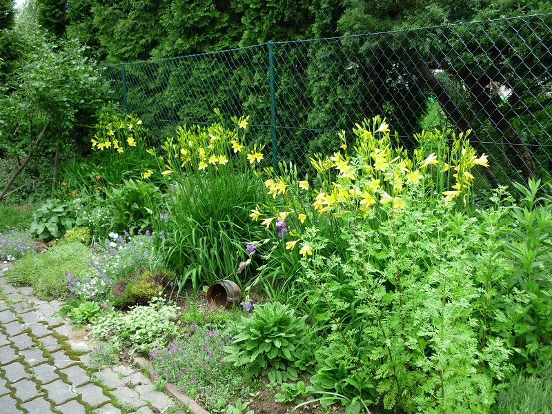 Maj - liliowce żółte, śniedki, irysy kłączowe fioletowe, kocimiętka fassena, zaczyna kwitnąć kuklik.