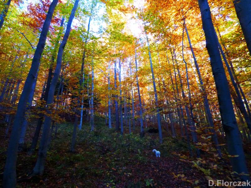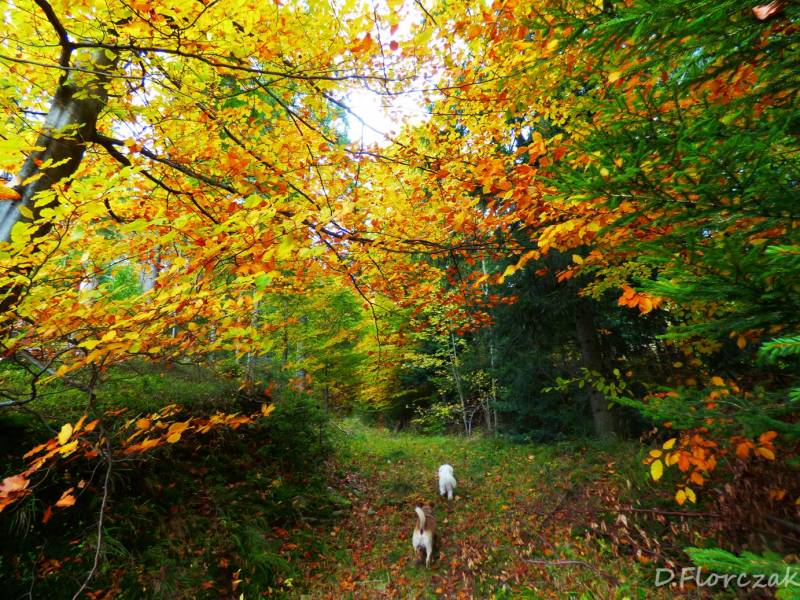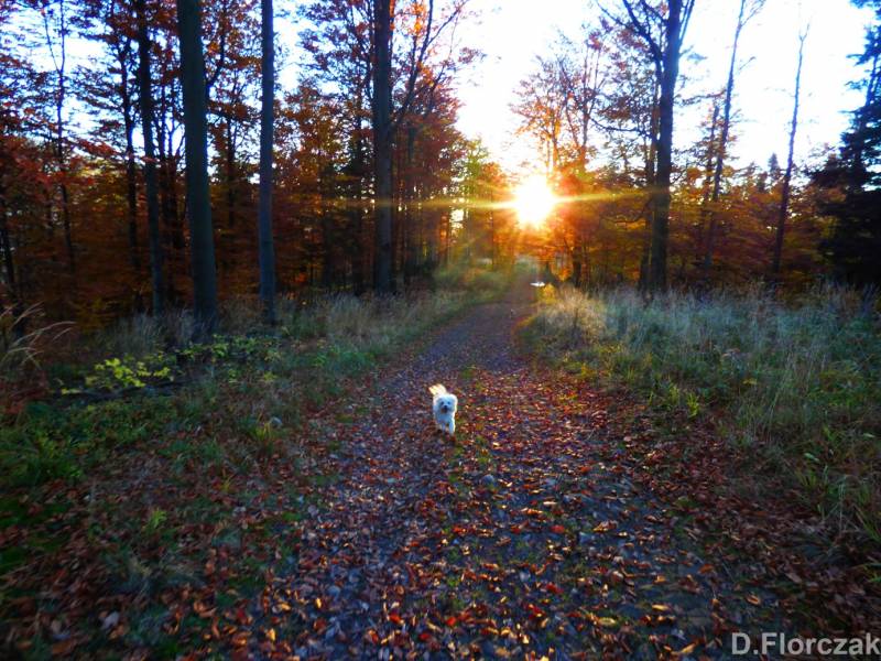 do tego po takim spacerze kąpiel obowiazkowa,ale Puszek nie jest zachwycony jej obecnościa,bo wie że musi iść z tyłu bo ona w tedy rządzi nie wolno,mu pobiec za zwierzyną bo ona zaraz biegnie za nim,na szczęście spacery z dwoma pieskami to tylko przy pięknej i stabilnej pogodzie.Na szlakach Państwowych lasów.I nie ma mowy żeby w lesie była na smyczy,bo na kazdej przeszkodzie musimy się odplątywać z gałęzi albo z drzew.