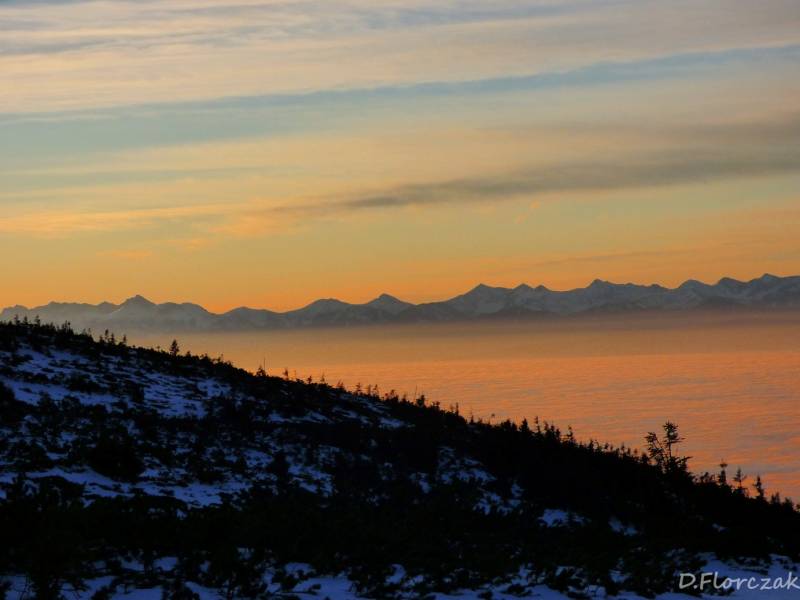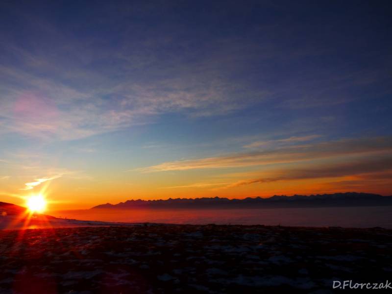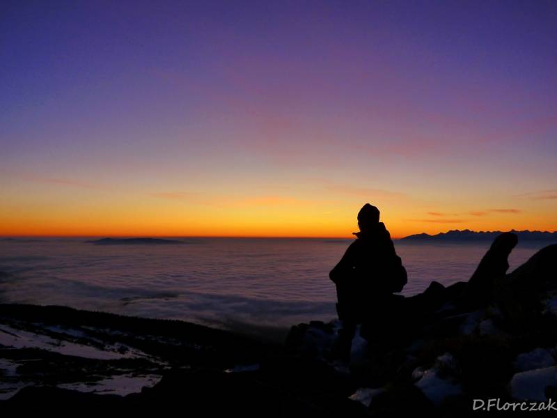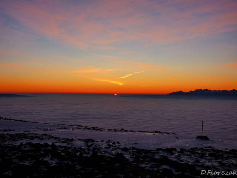 O 4,30 byłam na Krowiarkach i miałam 2h05 minut czasu do wschodu słońca.Na parkingu nie bylo ani jednego samochodu,znaczy to że na szlaku byłam tylko ja,podejście na Sokolicę jest najbardziej wymagajacym podejściem,zajmuje mi to zawsze 40 minut,albo mniej w zaleznosci od kondycji niestety tym razem szłam 43 minuty,szło mi się źle bo było mi za ciepło,stopnie niektóre były oblodzone,bo z drzew kapała woda i przy ziemi marzła,wyjezdżając z domu mieliśmy -2 st,a na Krowiarkach plus 2,zjawisko fenowe.Podejście wsród drzew widoków zadnych,tylko wielki księżyc oświetlał mi szlak,po wyjściu na Sokolicę las zostawilam za sobą i szłam w tunelu kosówki,stopnie były ze sniegui lodu,wyjeżdzone przez turystów z poprzedniego dnia.Widać było tylko bezchmurne niebo,księżyc gwiazdy,wylączyłam czołówkę bo zaczęło juz świtac,po drodze zawiesiło się kilka pajęczyn na mojej twarzy znakiem czego,jest to ze idę pierwsza na szczyt.Po dotarciu na Kępę moim oczom ukazuje się piękny widok budzącego się dnia,tatry na wyciagnięcie ręki i morze chmur,otaczajace cały Beskid Wyspowy i Orawę