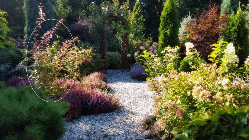 Żółty mi kompletnie nie przeszkadza, mało tego powiem że żółte liście bardzo rozświetlają ciemną zieleń iglaków. Ale u mnie dużo iglaków w odcieniu żółtym i jeśli to one mają stanowić tło dla różowych róż, to mi takie zestawienie już nie bardzo pasuje. Widziałam pięknie skomponowane żółte i różowe róże, właśnie z przywrotnikowymi obwódkami i było pięknie. Nic to, "pażywiom - uwidim". Choć nad takimi mniejszymi co prawda plamami myślę, trudno na raz wywalić z ogrodu wszystko co odbiega kolorem. Co się da - stonuję, a co nie... wkomponuję w jakieś "kolorowe" miejsca.