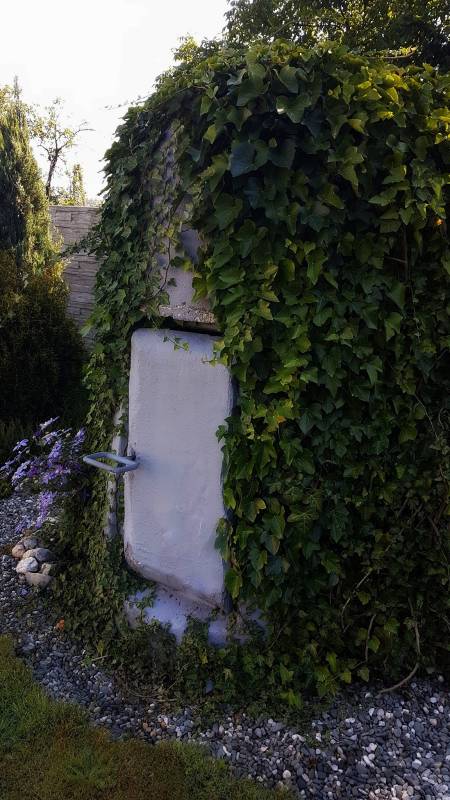 No i to mini, mini oczko o pojemności 250 litrów, więc służy ptakom, żabom i jaszczurkom. To zwykła wytłoczka z czarnego platiku. Forma umożliwiła dosypanie żwirku (żeby ukryć platik) i położenie kamieni w taki sposób aby zwierzaki mogły po nich swobodnie wyjść "na ląd". Pracy z nim niewiele, uzupełnić poziom wody, czasem wybrać ręką glony, woda jest czysta raczej dzięki roślinom i małej pompce na solar. Na razie się sprawdza