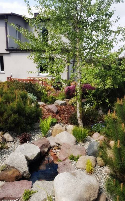 Mój M. chyba wziął sobie bardziej do serca to moje ogrodowanie i pomógł mi przerobić to małe oczko - wcześniej było obłożone tylko otoczakami, ale pies który polubił picie wody z tego miejsca ciągle je zrzucał. M. przytargał ze skalniaka płaskie kamienie granitowe. Są bardziej płaskie i stabilne. Pies się cieszy, a ostre krawędzie starałam się złagodzić otoczakami. Na razie tak musi być i już.