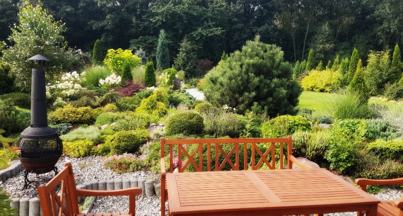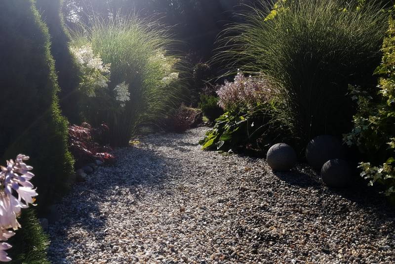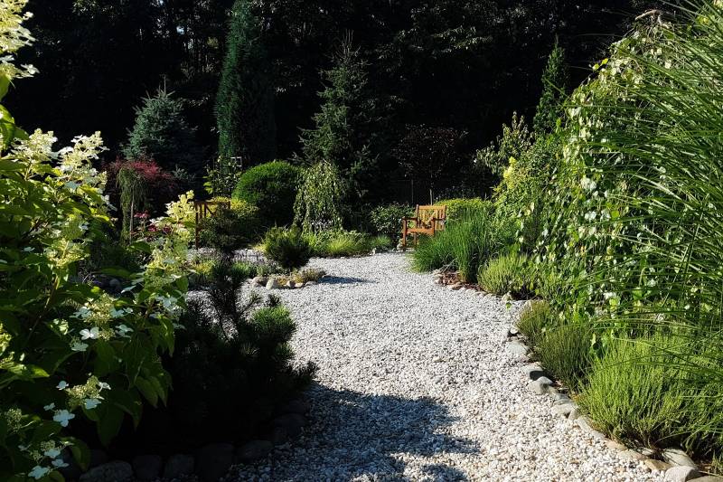 Na żwirowy taras zdecydowałam się z bardzo prozaicznego powodu - brak kasy. Miał to być etap przejściowy, ale już wiem, że nie przerobię go na nic innego. Wygląda naturalnie, komponuje się z resztą ogrodu, tani w wykonaniu, a z utrzymaniem w czystości nie mam problemów: liście z lasu aż tak daleko nie lecą, plewiąc w skarpie i tak wrzucam wszystko od razu do wora. Owszem był problem ze ścieżkami, bo tam początkowo opadłe liście wybierałam ze żwirku nie przymierzając jak Kopciuszek, ale on sobie siedział, a ja na kolanach. Sprawę rozwiązał odkurzacz do liści. Wydmuchuję liście na trawę i zgrabiam, a że trochę kory się przy okazji wydmuchnie z rabat - to już inna bajka.