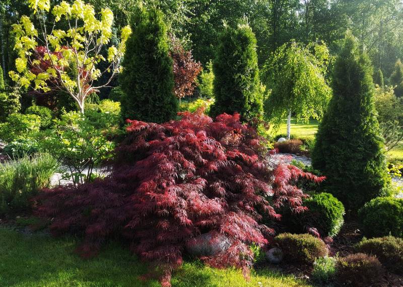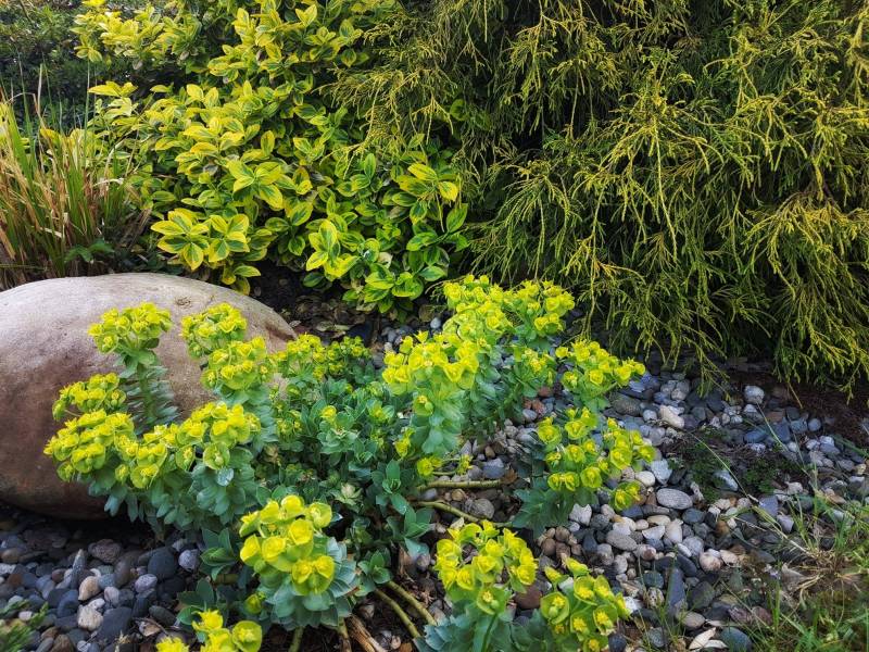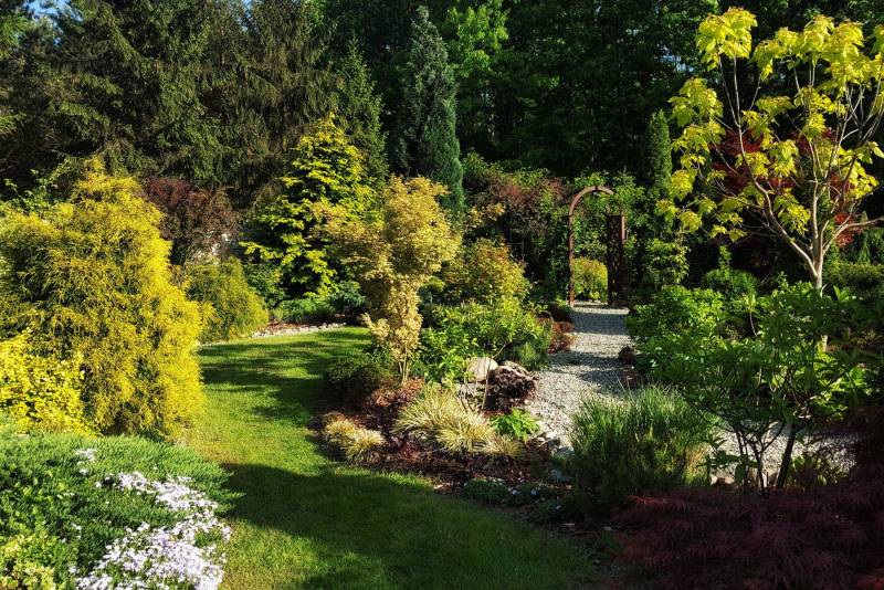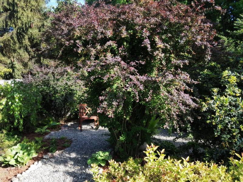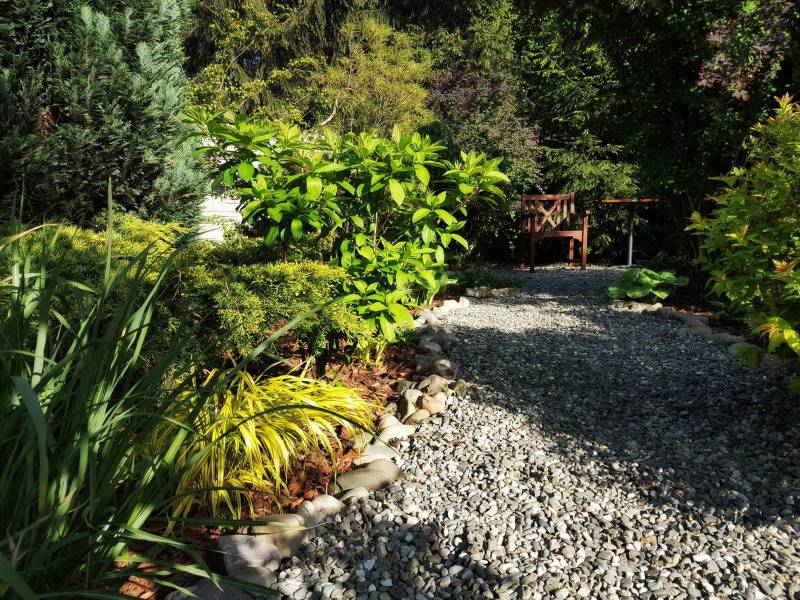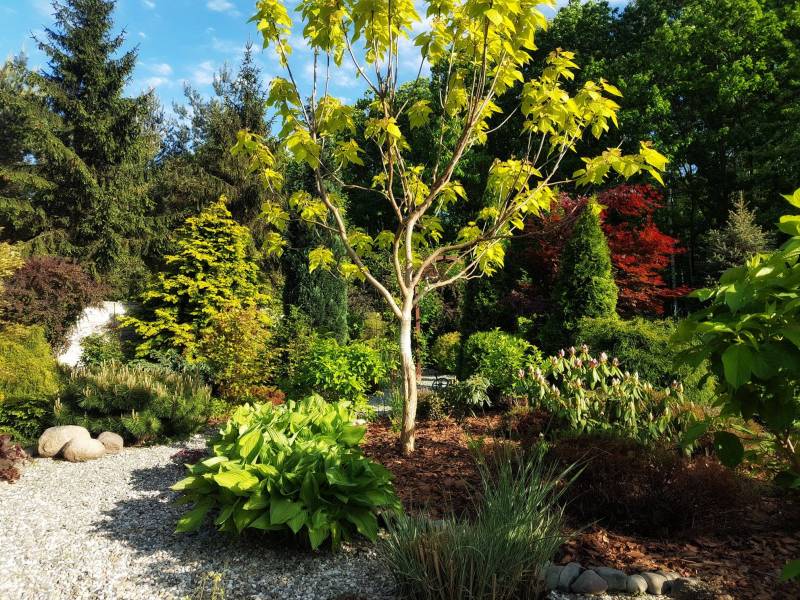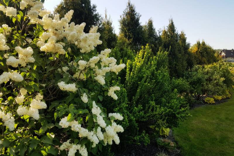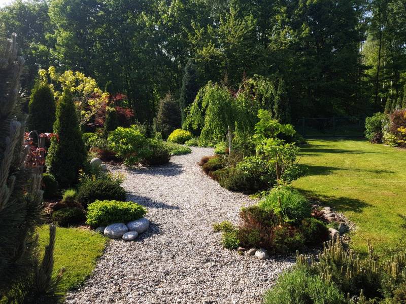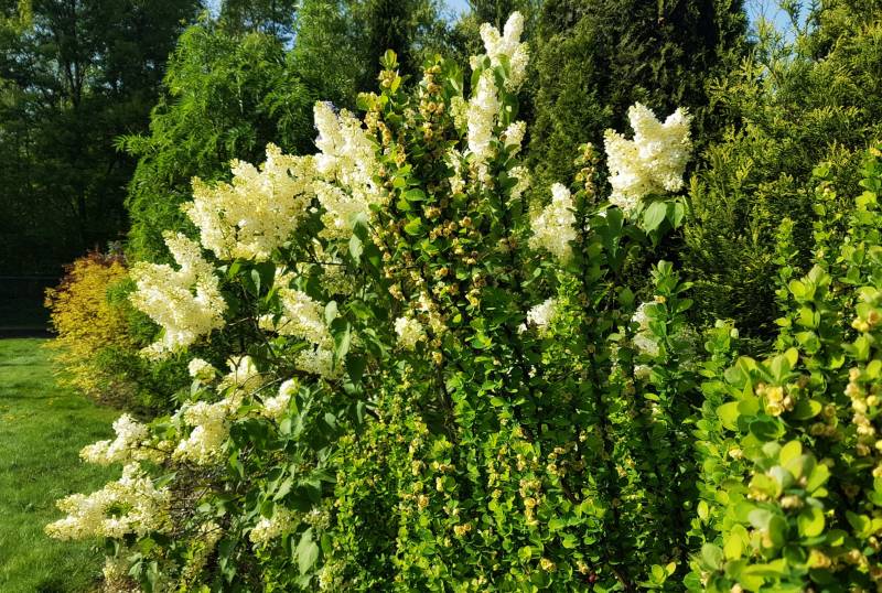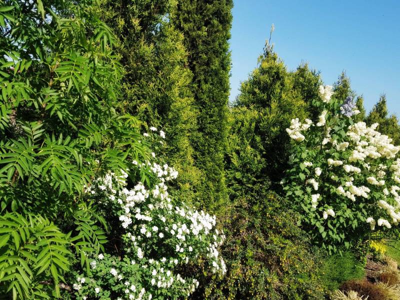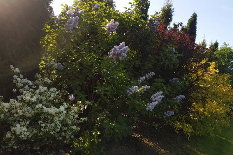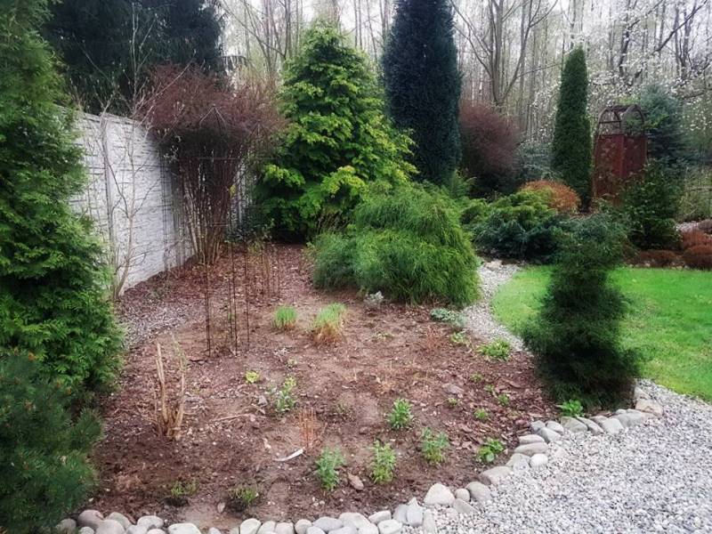 Tnę, sprzątam i sprzątam, i wycinam, bo mróz zniszczył mnóstwo wrzosów i wrzośców - już wywaliłam blisko 20 a to jeszcze nie koniec, wymarzł nawet ubiorek wiecznie zielony, a przecież taki odporny, padły wszystkie turzyce "Ogień Prerii" w ilości 15 sztuk... przesadzam i dosadzam... zmieniam koncepcje. Wywaliłam 4 berberysy (bez większego żalu) no i zostało puste miejsce. Dzięki wycince wreszcie się odsłonił dereń kwiecisty rosnący pod płotem, no i zyskałam dużo miejsca na byliny. W planie jest rabata w odcieniach niebieskiego i fioletu i różowości, choć w tle będą rosły dwie pnące róże Moonlight i Maigold, ale one mają różowe obrzeża płatków, więc może jakoś to się wpasuje., tym bardziej, że pod płotem rosną clematisy "made in LIdl" w kolorze fioletowym, więc może przełamią tę żółć?