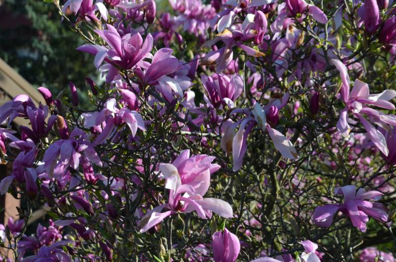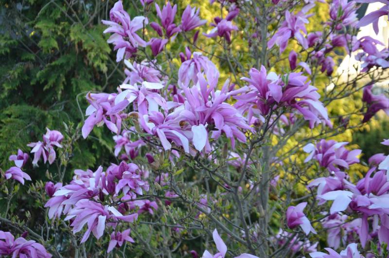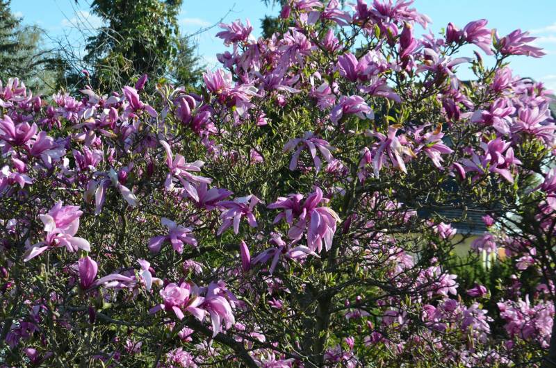 Magnolia 'Betty' została posadzona, jak się okazało, w bardzo dobrym miejscu. Kwitnie tak obficie co roku. Kiedyś, jak była jeszcze młoda, to przygięłam do ziemi kilka gałązek, które ukorzeniły się. Jedna rośnie u mnie w podwarszawskim ogrodzie. Druga w ogrodzie niedaleko Myślenic, a trzecia w ogrodzie znanego miłośnika rododendronów z podwarszawskiej miejscowości.
