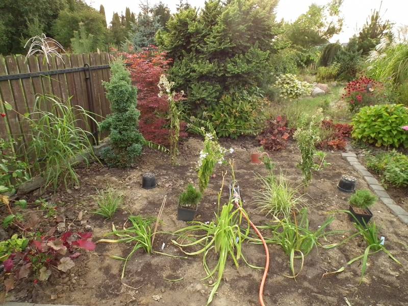 dodam jeszcze że przy ściąganiu maty nie obyło się bez strat musiała wykopać sporą kępę lawendy bo poprostu się z nią zrosła i nie było innego wyjścia. Narazie nic nowego na niej nie sadziłam poza ukorzenionym patykiem hortensji , którą chciałabym poprowadzić na pniu, teraz przez zimę muszę pomyśleć co tam ostatecznie będzie rosło. Napewno zostanie karagana, miskant Morning light, sosenka i rozplenica Moudry nad lawendami się zastanowię ale mam na to sporo czasu .