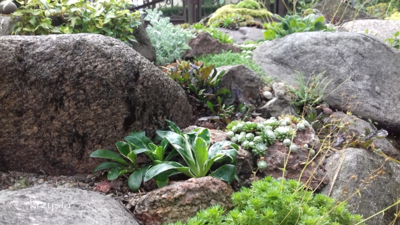 Jesienią wydostaliśmy wszystkie kamienie uważając na rojniki i mech wink-3 , dosypaliśmy ziemi, ułożyliśmy kamyczki z powrotem i zaczęłam zasiedlać szczeliny między nimi.