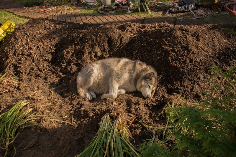 Wiele póki co nie widać poza obrażonym odwłokiem obrażonego psa, którego właśnie wywaliłam z mokrej ziemi spomiędzy sadzonek