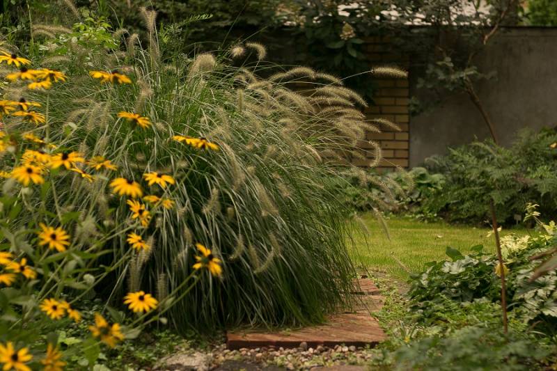 Od Ewy Jarmulak trawy(Sporobolus różnołuskowy i Przyostnia razy dwa), powojnik Purpura Plena Elegans i róża Venusta Pendula