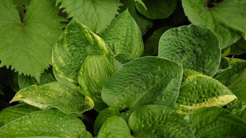 Teraz tylko od czasu do czasu go przestawiam. Ogród jest więc zielony, skutków suszy nie widać. Hosty są wielkie, pierwsze dalie kwitną