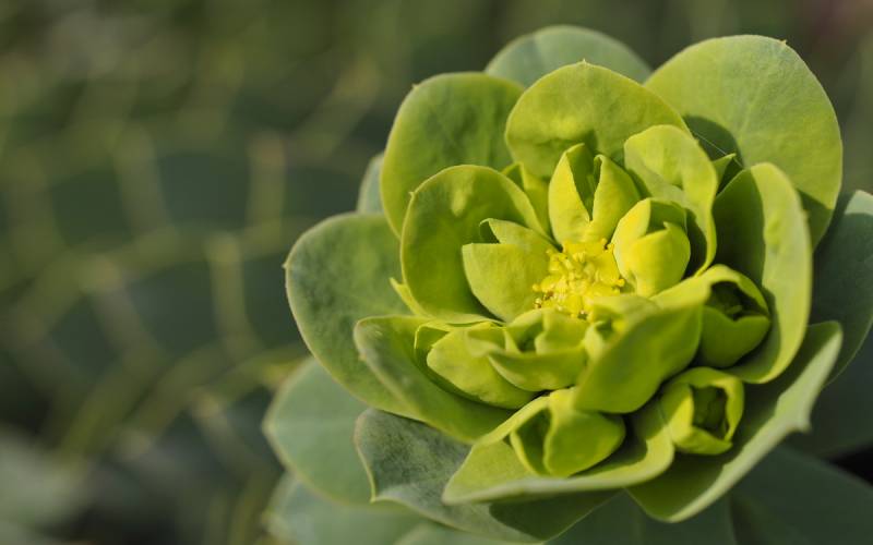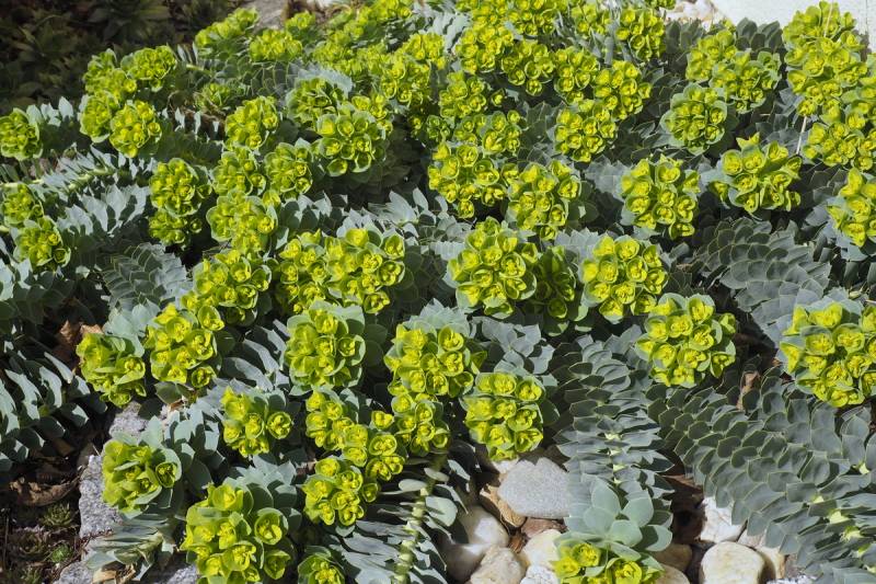 ... a nawet wilczomlecz mirtowaty. Jedna z moich licznych samosiejek, ten akurat postanowił wyrosnąć w żwirku okalającym dom. Jest gigantyczny