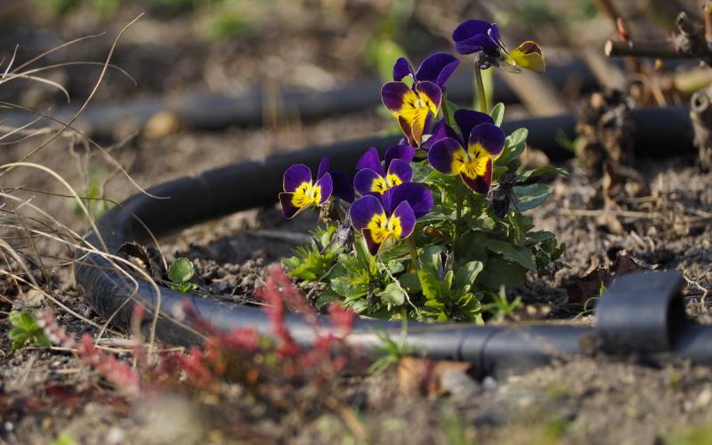 i w ogóle nie przeszkadza mu brak ziemi. Rośnie w żwirku, pod którym jest włóknina, a niżej piach wymieszany z kiepską ziemią z budowy, którą był obsypany fundament.