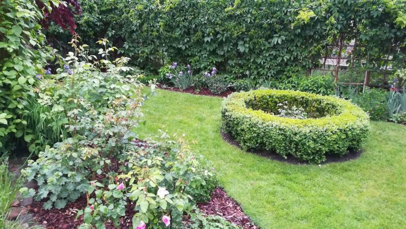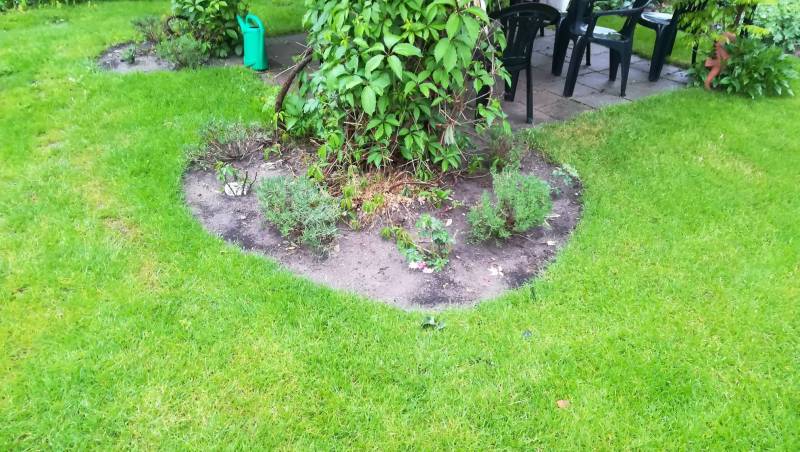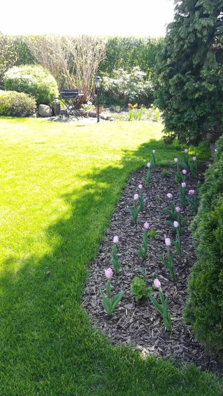 Wczoraj zdecydowałem się na wyściółkowanie nowej rabaty różanej korą. Wiem, że to dyskusyjne. Niestety obecnie rabata jest zbyt odsłonięta- nie ma jeszcze bylin uzupełniających. Pielenie jest koszmarem. Tak samo będzie z podlewaniem.