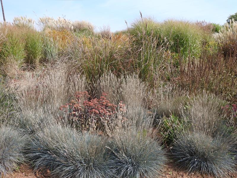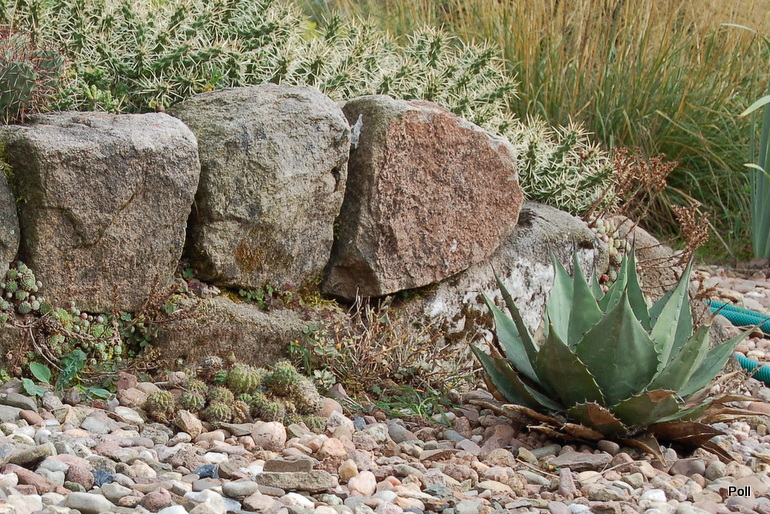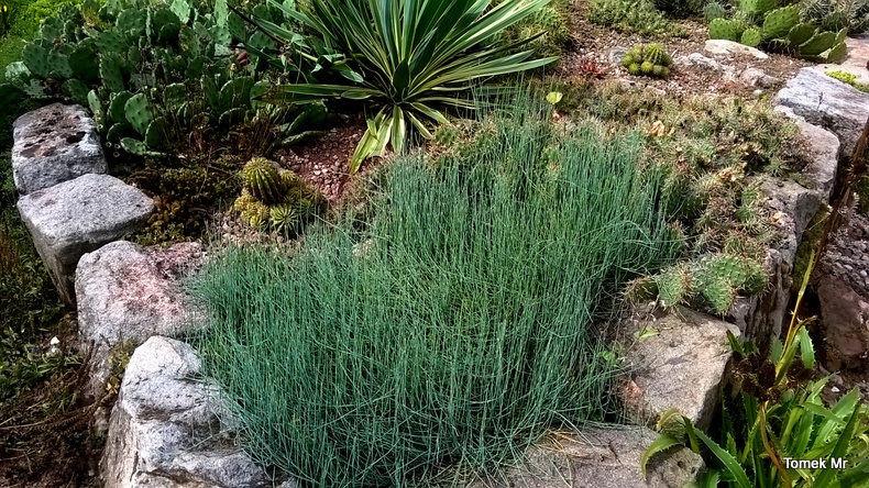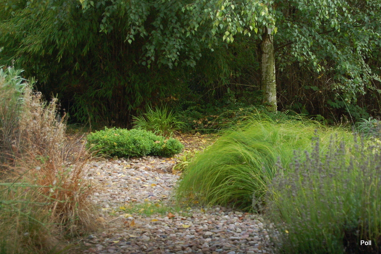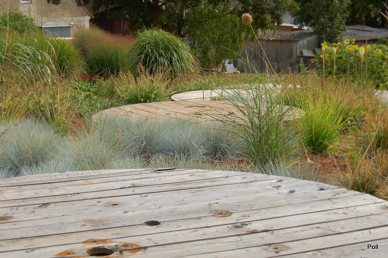 Ostatnio powstałym miejscem jest położona na słonecznym stoku rabata trawiasta, której nieco kosmicznego charakteru nadają podesty-ścieżki o kształcie koło. Był to kapitalny pomysł i gdy rośliny się rozrosną, będzie to jedna z najpiękniejszych rabat trawiastych, jakie widziałam. Wielkim plusem i ułatwieniem, jest brak konieczności skupienia się na ograniczonym terenie, bo miejsca jest jeszcze sporo , więc można to i owo dodać.