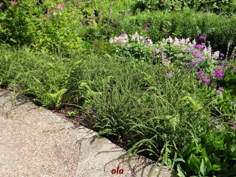 W tym maleńkim przedogródku zastosowane - jak widać - różne rośliny : zarówno na stanowiska słoneczne, jak i do cienia. Miło, że pomyślano również o paprociach