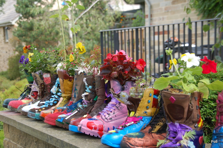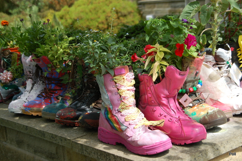 Ten problem jest coraz częściej podnoszony w prasie, czy telewizji. Bije się na alarm, ze Anglia staje się szarym, wybetonowanym krajem. Stąd sporo inicjatyw, m.in. RHS (Królewskie Towarzystwo Ogrodnicze), które mają ponownie obudzić ogrodniczego ducha w narodzie angielskim. Podczas mojej ostatniej wizyty w ogrodzie Harlow Carr ( zapewne i Olusi też ) , trwała akcja RHS pod tytułem 'Zazieleńmy szarą Brytanię'. Prowadzono pogadanki, wydano ulotki i plakaty, ale nie tylko... By zwrócić uwagę na problem w jakiś nietuzinkowy sposób, z pomocą 6 Regimentu Królewskiego Korpusu Logistycznego , który współpracuje z RHS CO w Yorkshire, zorganizowano dla uczniów tutejszych szkół 'Boot camp'.