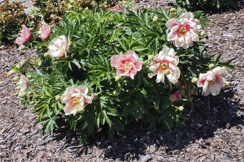 Hodowca: Thierry Rat, Francja (2007), w sprzedaży po 2012 Kwiaty: pojedyncze lub półpełne, duże (Ø 15-18cm) delikatnie malinowe z nutą czerwieni u nasady płatków, które otaczają lśniące, złote pręciki Wysokość: około 70 cm Pędy: mocne łodygi utrzymują kwiaty w pozycji pionowej nawet w deszczu, odmiana niezwykle obficie kwitnąca Liście: bardzo zdrowe, dzięki czemu roślina pozostaje atrakcyjna aż do późnej jesieni, nawet po kwitnieniu Termin kwitnienia: przełom maja i czerwca