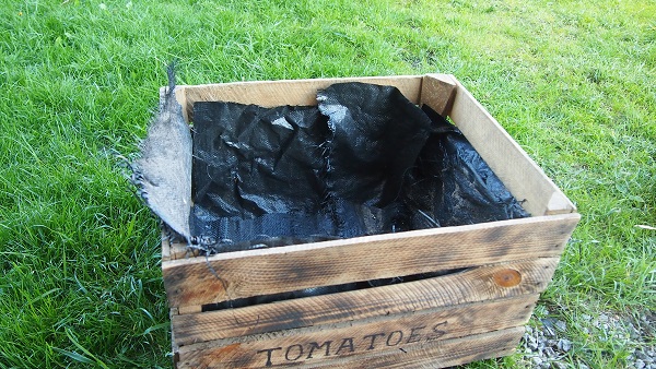 Skrzynki są wyłożone agrotakniną. Z worków jutowych wyciełąm tylko paski i obiłam nimi górę, dla efektu estetycznego.