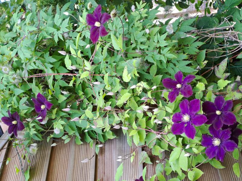 Kwiaty pojedyncze, ciemnopurpurowe, aksamitne, zbudowane z 6 działek. Płatki lekko pofalowane na brzegach, od spodu srebrzyste. Kwiaty duże, średnicy do 14cm. Pylniki liczne, żółte, wyraźnie widoczne na tle kwiatów. Owocostany puszyste, średniej wielkości. Kwitnie od czerwca do lipca na zeszłorocznych pędach. Powtarza kwitnienie na pędach nowych do jesieni, ale to kwitnienie jest słabsze.