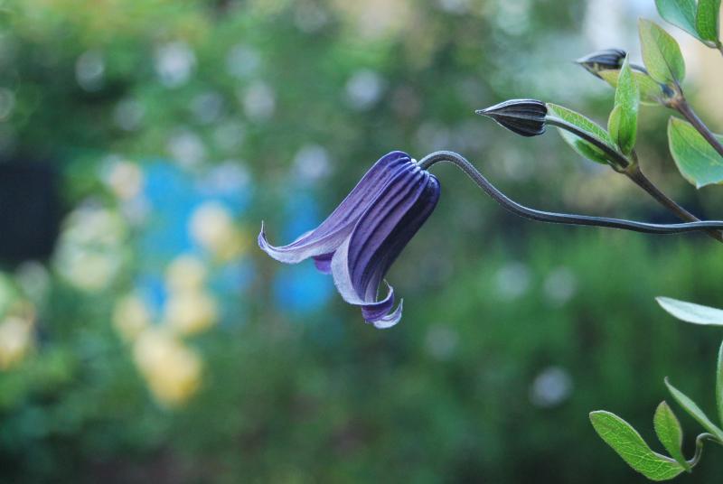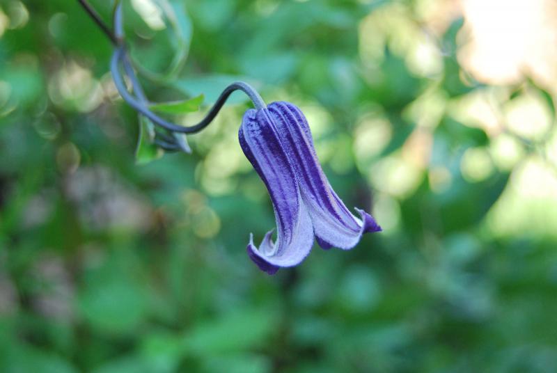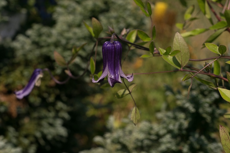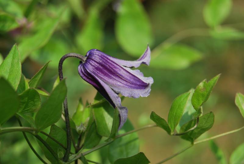 Kwiaty: fioletowo-granatowe, małe, średnicy ok. 6 cm, zwisające, złożone z 4 działek, kwitnie od polowy VI do końca IX.
