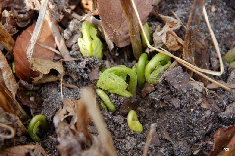 Moje Glaucidium palmatum już ruszyło. Nad powierzchnią ziemi pojawiły się charakterystyczne, błyszczące pierścienie zwiniętych łodyg