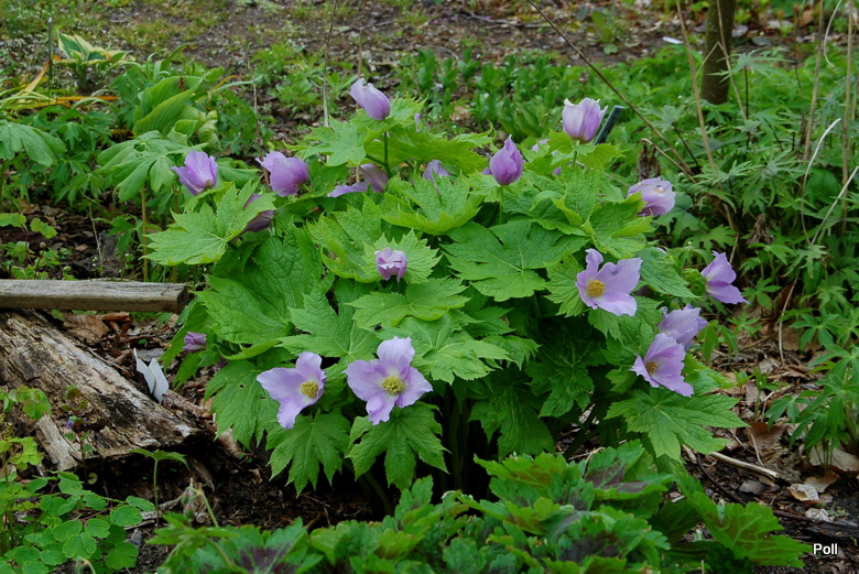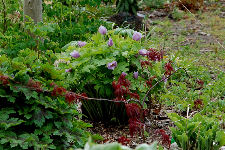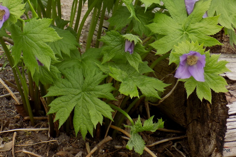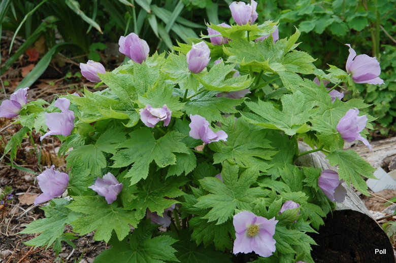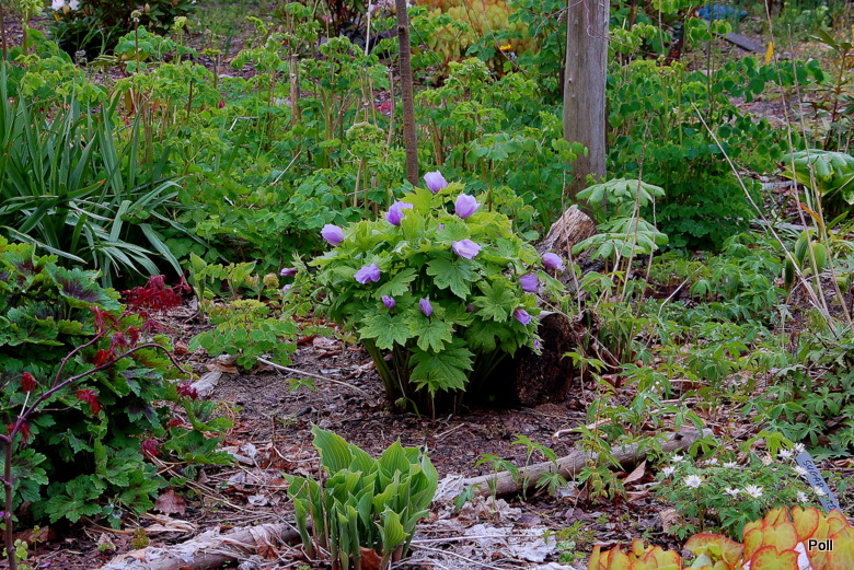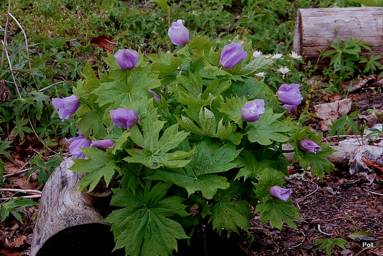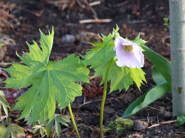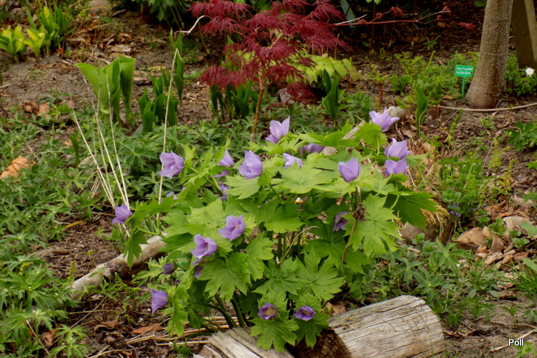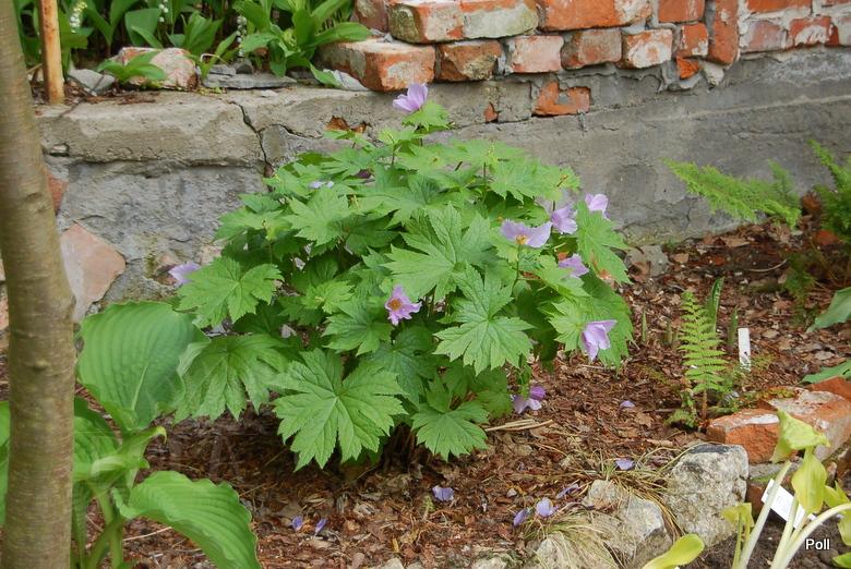 Ja swoje Glaucidium palmatum podzieliłam w ubiegłym sezonie, więc nieco je zmniejszyłam optycznie Tegoroczna gorąca wiosna spowodowała bardzo szybkie przekwitanie wczesnokwitnących bylin . Tak więc, pełnia kwitnienia przypadła na ostatnią dekadę kwietnia, ale po kilku dniach nie było już śladu kwiatów. Późnym latem przesadziłam więc roślinę na inne, chłodniejsze stanowisko za mur hostowiska. Czy ten zabieg wyjdzie na zdrowie mojemu glaucidium, przekonam się wiosną.