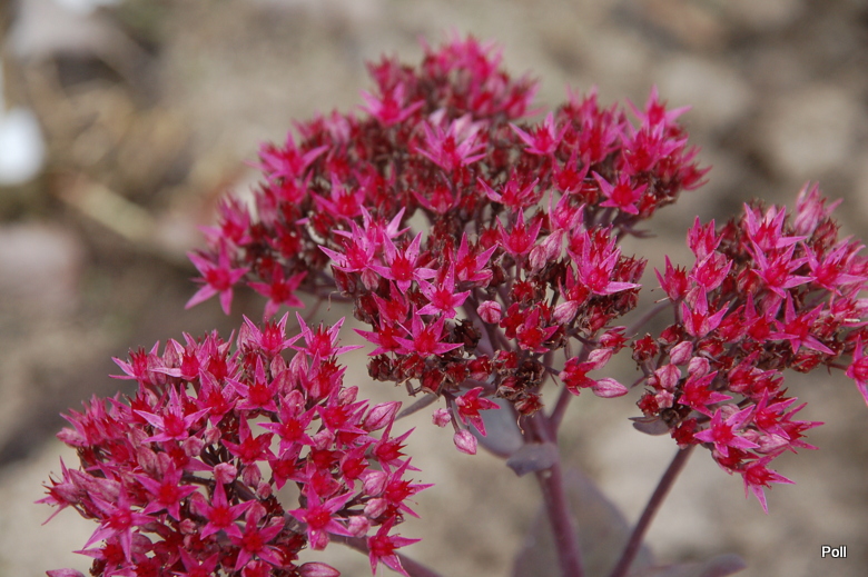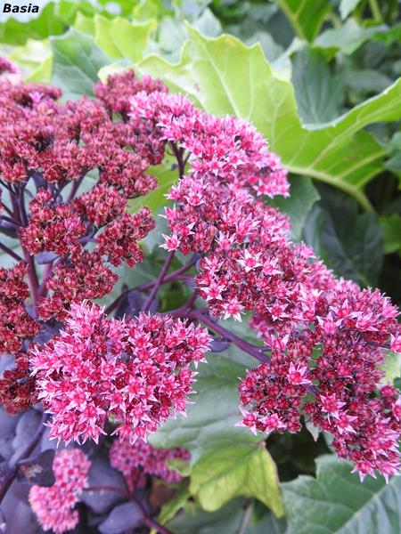 Kwiaty pojawiają się od sierpnia i kwitną do mrozów. Z początku zielone, w miarę rozkwitania przebarwiają się do ciemno-różowych. W bardzo gęstych, spłaszczonych niby baldachach, pokrywają całą roślinę jak parasol.