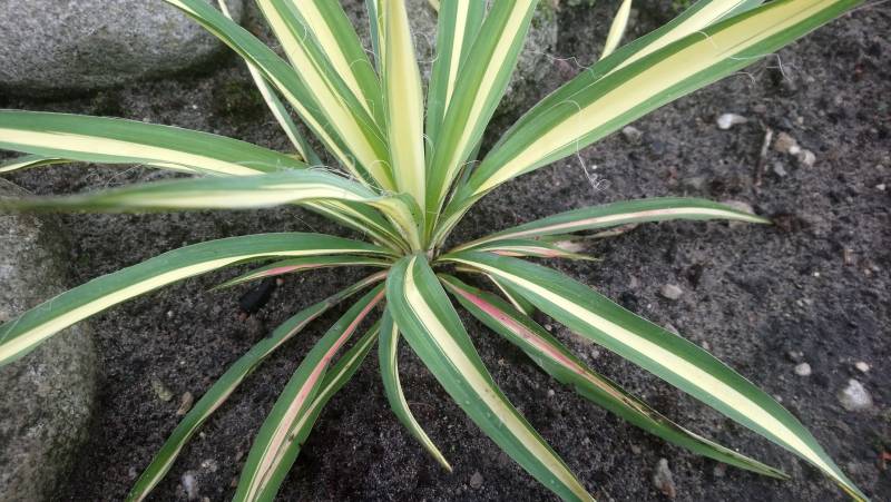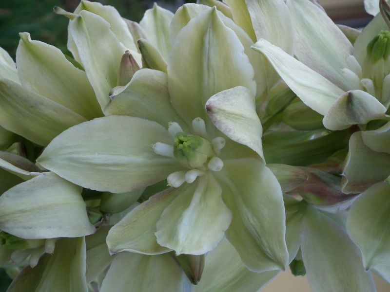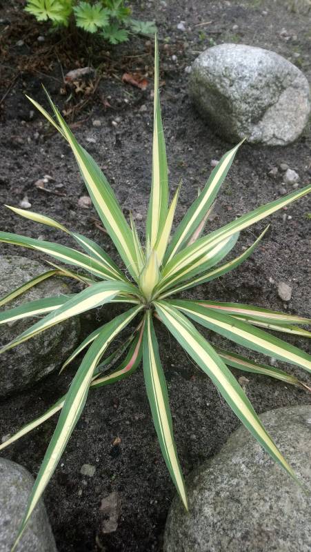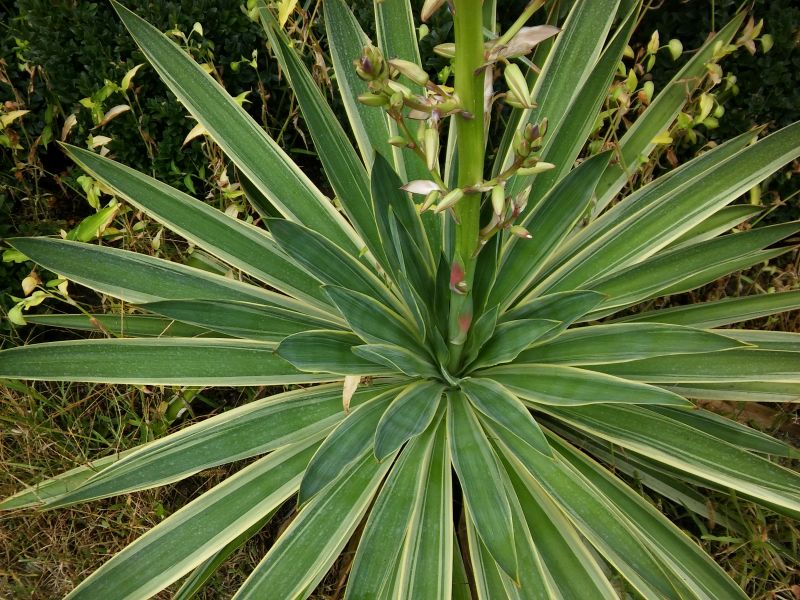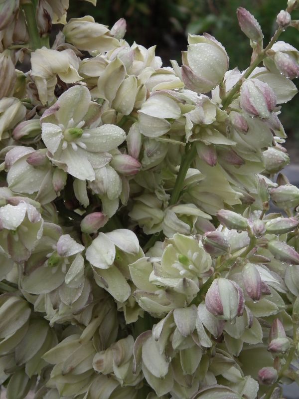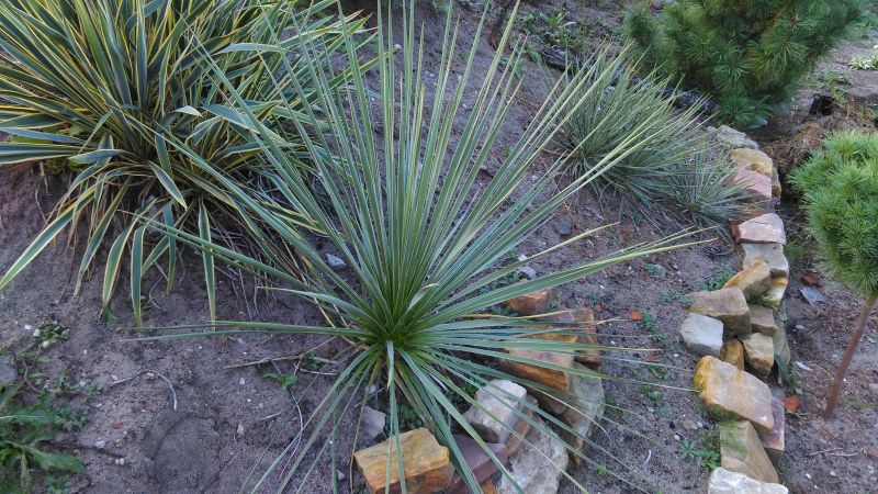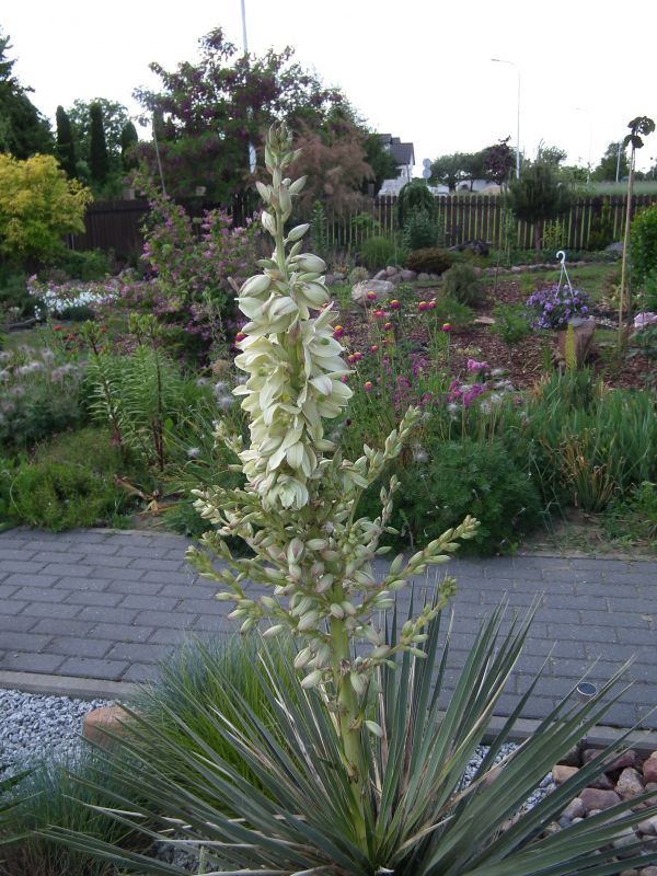 Kwiaty nisko osadzone jak u juki sinej tylko kwiatostan znacznie mniejszy i bardzo zwarty, do 50 cm