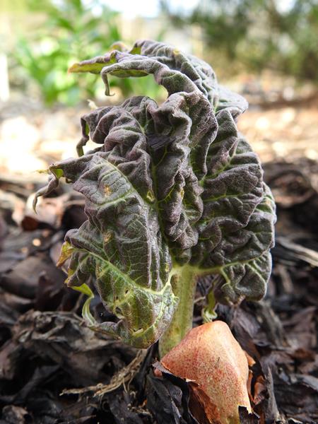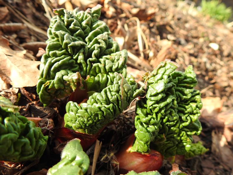 Rabarbar dłoniasty juz sie powoli gramoli z ziemi. To spektakularny widok, jeden z najładniejszych wiosną