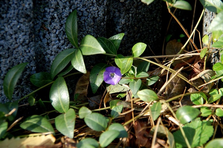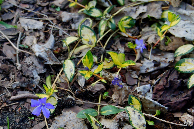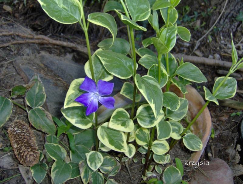 Mój Vinca major'Variegata' swoją pierwszą zimę przetrwał w doskonałej formie, przeczytałam wcześniej na forum, że długie pędy mogą przemarzać i przysypałam je liśćmi. Wiosną wypuścił się na kilka metrów, ukorzenił, ale kwitł tylko kilkoma kwiatkami.