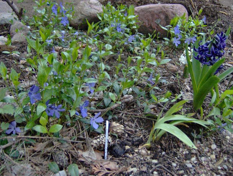 U mnie barwinek, najzwyklejsza odmiana, rośnie pod lasem w wilgoci i na suchej skarpie pod jałowcami. Pod lasem rozciąga się szeroko, a suchym miejscu jest bardziej zwarty.