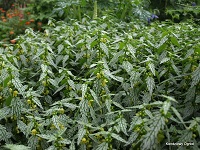 Liście: sercowate, naprzeciwlegle ułożone na 3cm ogonkach. Piłkowane, owłosione, zielone lub z białymi plamami.